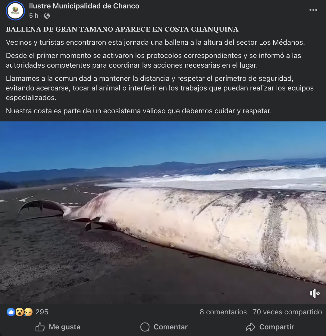 Ante la magnitud del ejemplar, se dio cuenta a la Capitanía de Puerto de Constitución, institución encargada de coordinar las diligencias técnicas y evaluar el estado de salud del animal marino en este hallazgo en Chanco 2026.